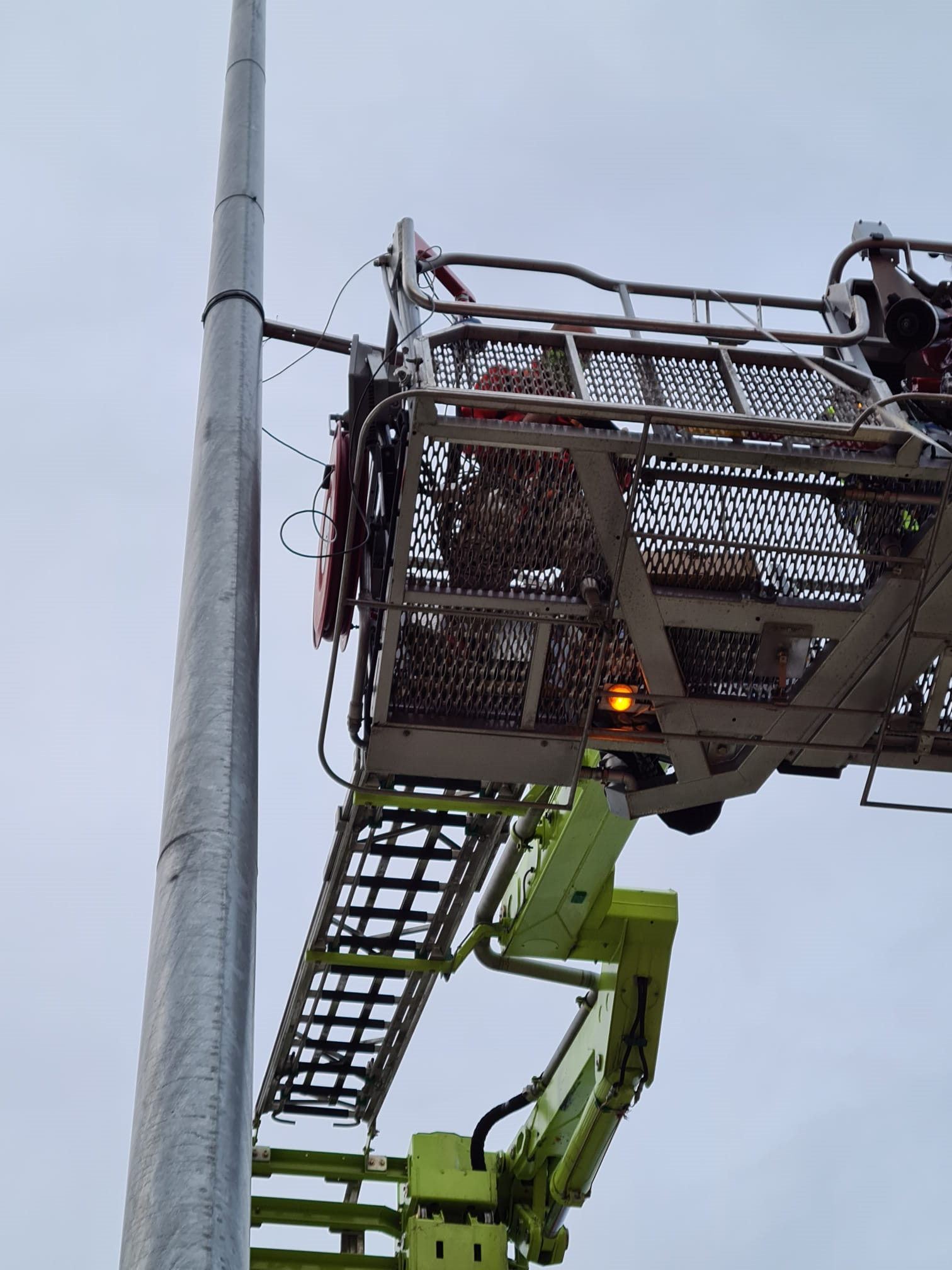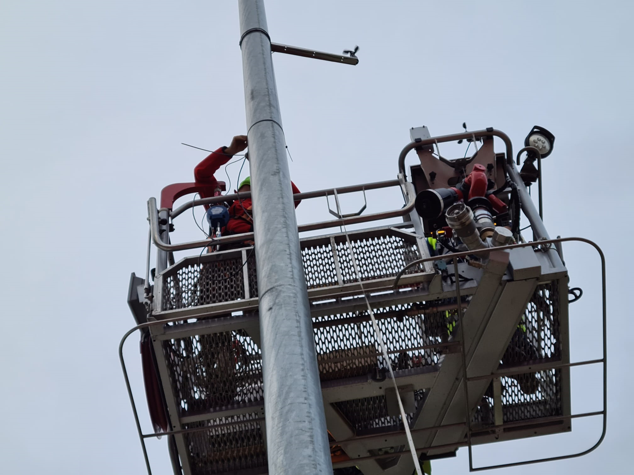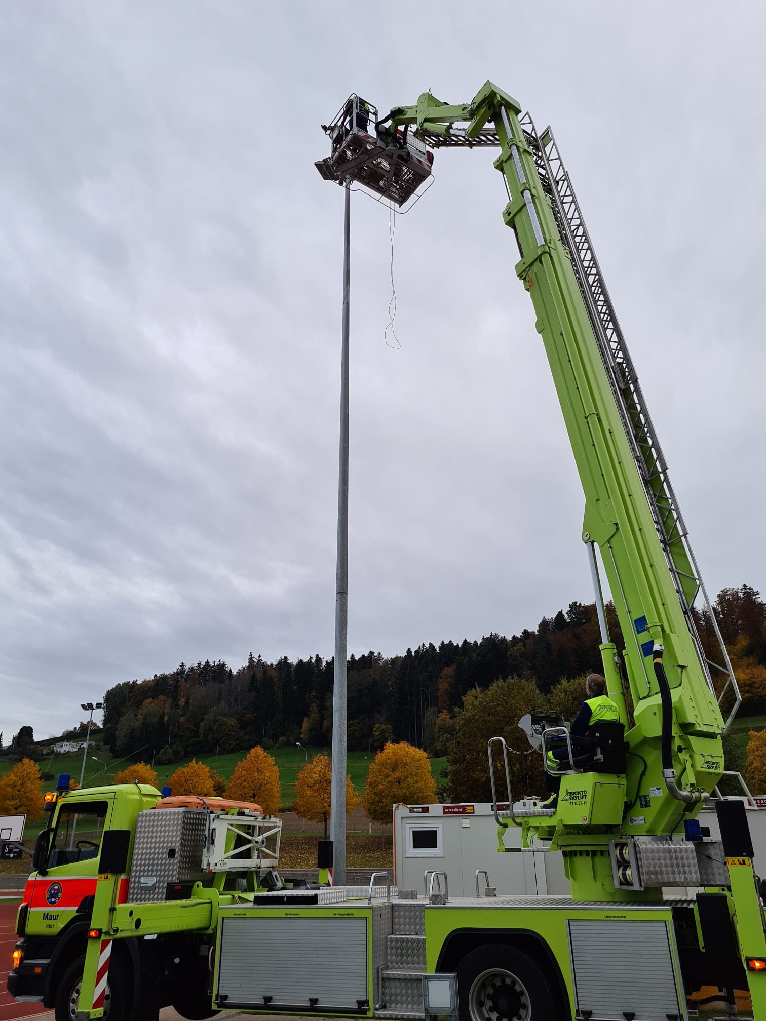 Im Rahmen des «Einweihungsfestes» der Solaranlage Looren am 22.10.2020 installierte Daniel Studer mit der Unterstützung der örtlichen Feuerwehr eine Windmessanlage auf der Flutlichtanlage. Diese Anlage wird nun während eines Jahres verschiedene Wind- und Wetterdaten aufzeichnen, so dass anschliessend das Potential für die allfällige Installation einer Windenergieanlage ermitteln werden kann.
